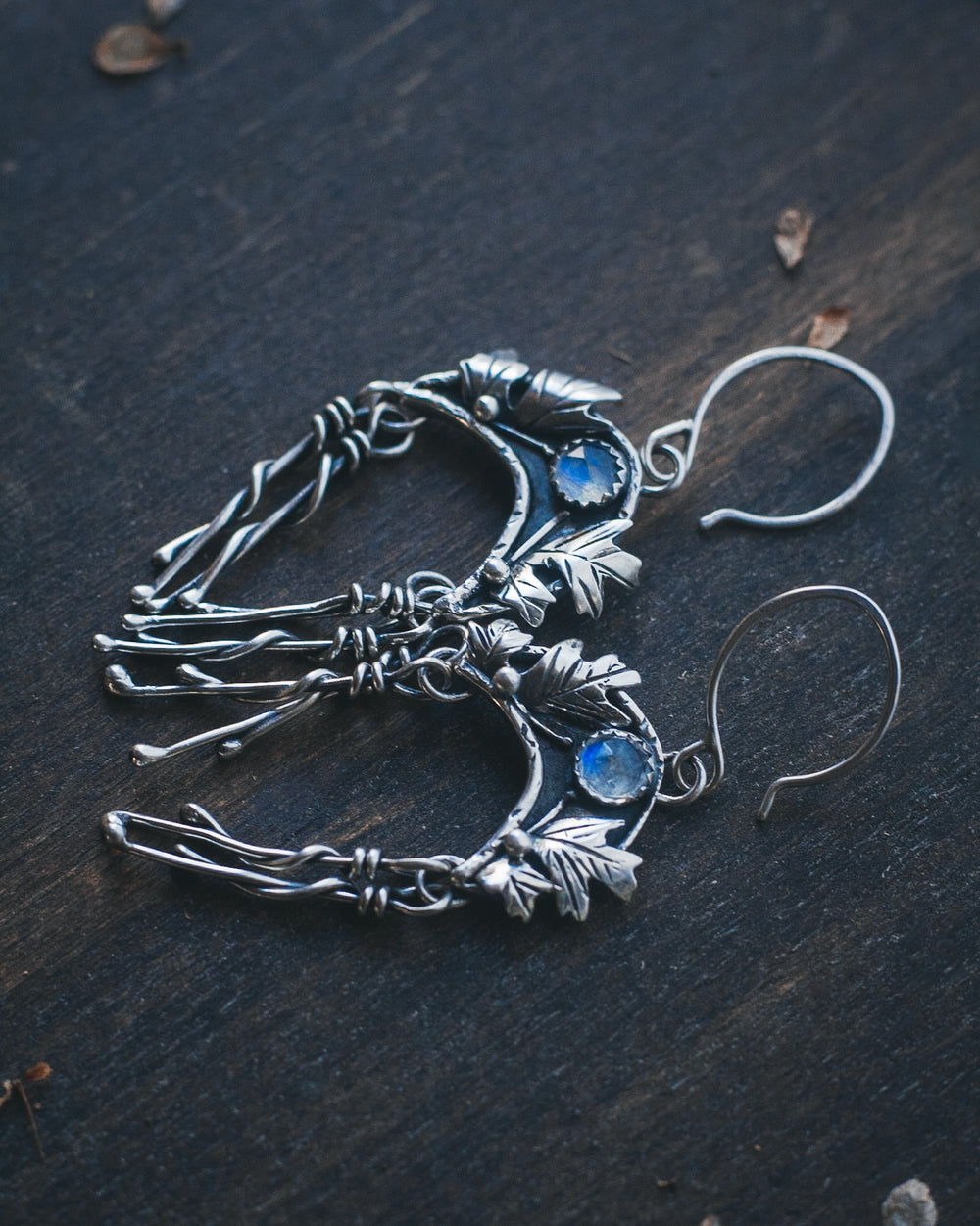 Continuing my ode to the moon and the mysteries of a forest in transformation, these earrings are a striking combination of elements.  Small crescent moon shadow boxes textured and adorned with my signature vine like fringe, faceted moonstones and handmade oak leaves.