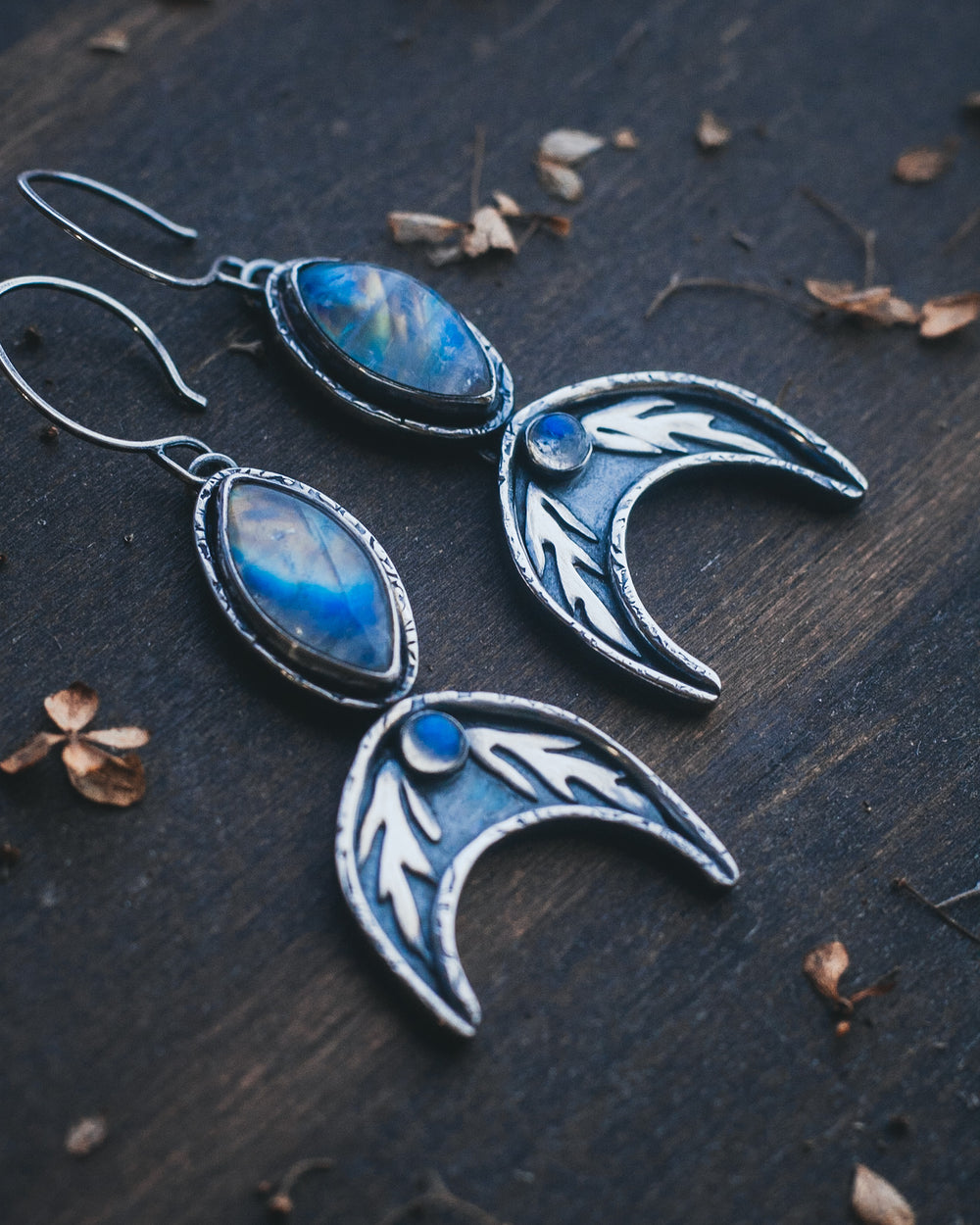 Forged from sterling and set with rainbow moonstone. The sterling silver has been forged to create crescent moon shaped shadow boxes, each adorned with botanical elements and set with moonstone. A marquise shaped moonstone has been set with a textured border atop each shadowbox. A patina has been applied and then brushed back for depth. Total length is approximately 2 1/4".