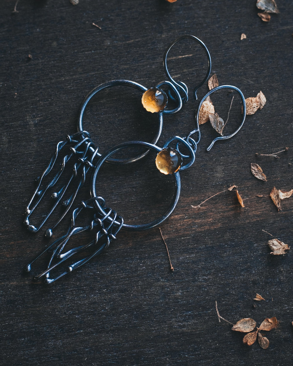 These earrings feature my signature fringe created from sterling silver wire. Citrine stones and small silver hoops create a lovely profile. I've given these ladies a patina, and then polished for shine. Handmade ear wires finish these earrings and will secure them to your ears.