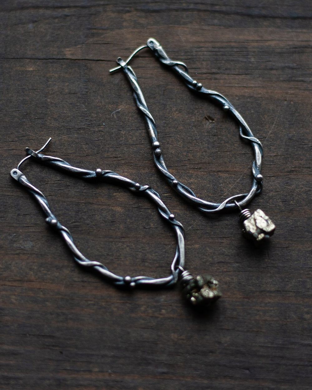An elongated and curvaceous leaf shape has been vine wrapped and studded in silver dew drops. One nugget of pyrite graces each hoop raising the drama level. I’ve applied a patina and then brushed it back to highlight the gorgeous details.